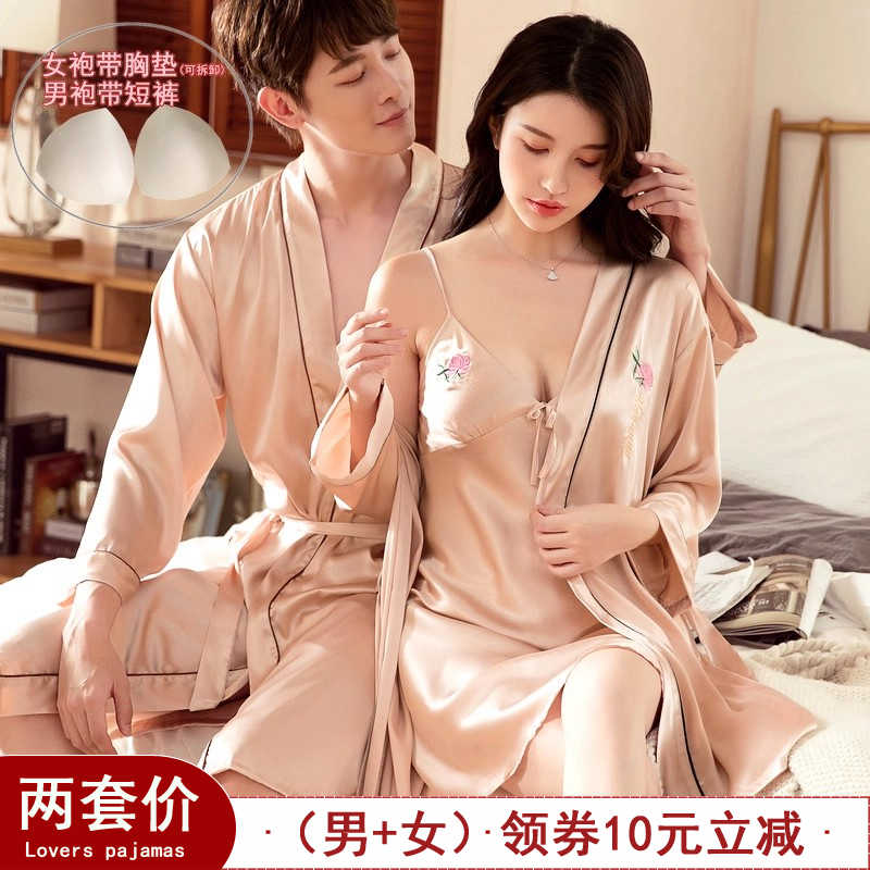 春秋季睡袍仿真丝情侣浴袍性感丝绸睡衣女睡裙夏男长袖冰丝家居服
