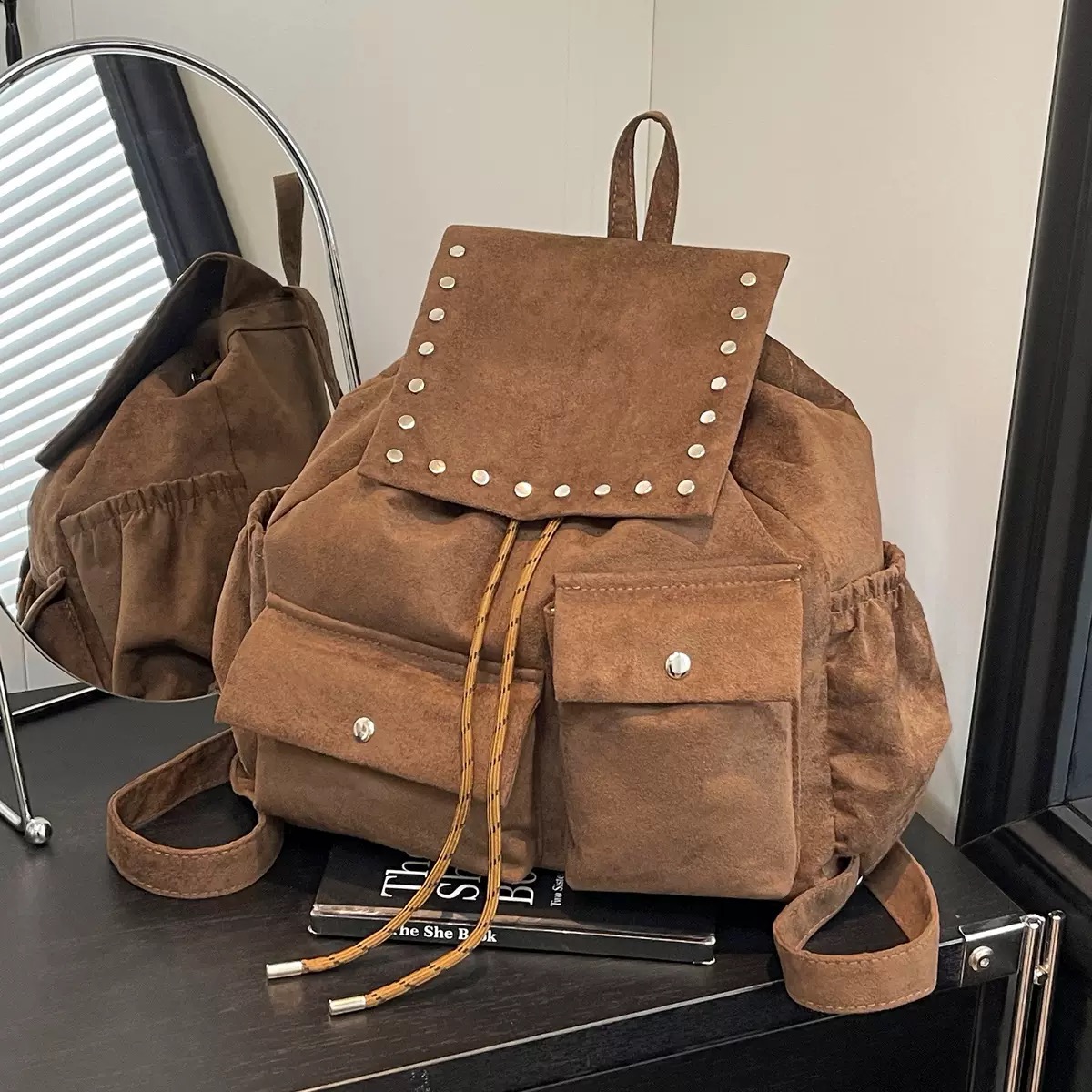 女士复古麂皮双肩包女大容量铆钉装饰通勤百搭背包女出行旅游包女