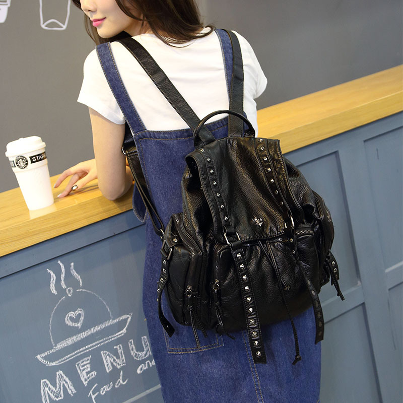 水洗皮双肩包女2022新款韩版软皮大容量旅行背包铆钉复古单肩两用