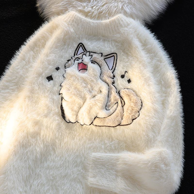 柔软马海毛减龄卡通KT猫刺绣2025秋冬宽松显瘦圆领开衫毛衣外套女