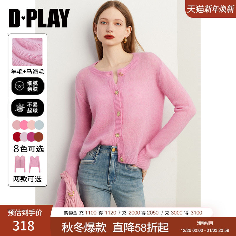 DPLAY2025秋季马海毛毛衣粉色修身针织开衫小香风外套上衣女