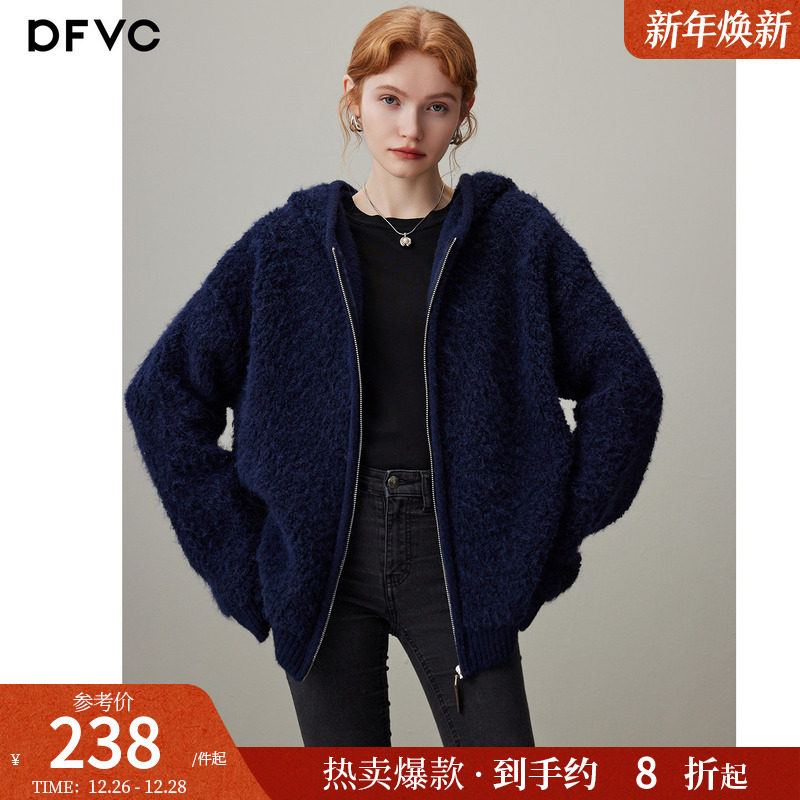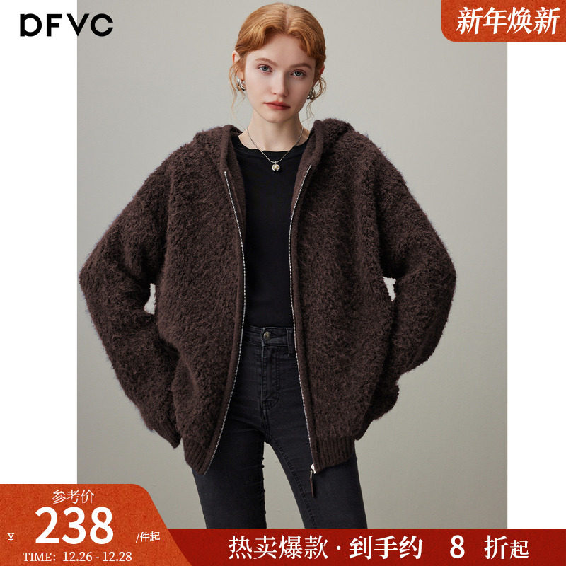 dfvc慵懒风羊毛马海毛针织开衫女2025年冬季新款连帽宽松毛衣外套