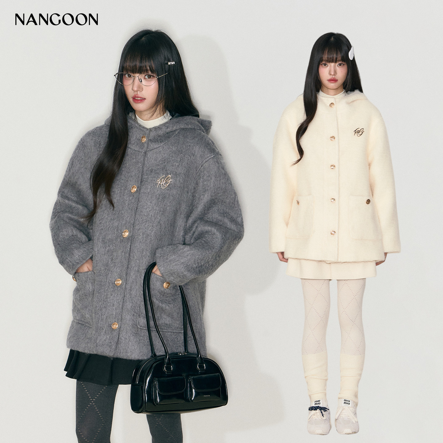 NANGOON 羊毛马海毛连帽学院风毛呢外套秋冬新款女设计感上衣