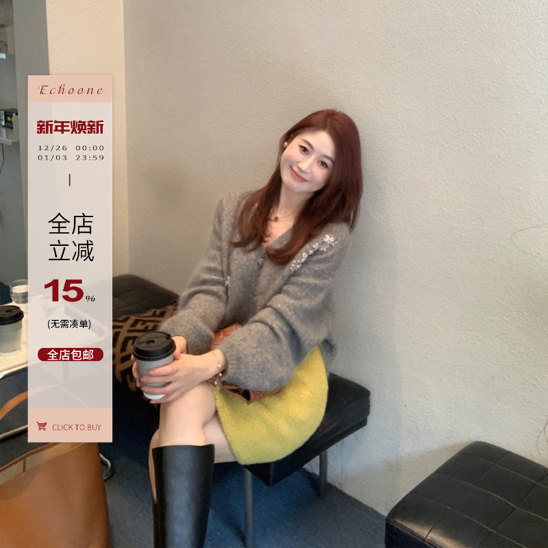 Echoone Viento 高品质马海毛针织开衫高级感时尚灰色毛衣女外套