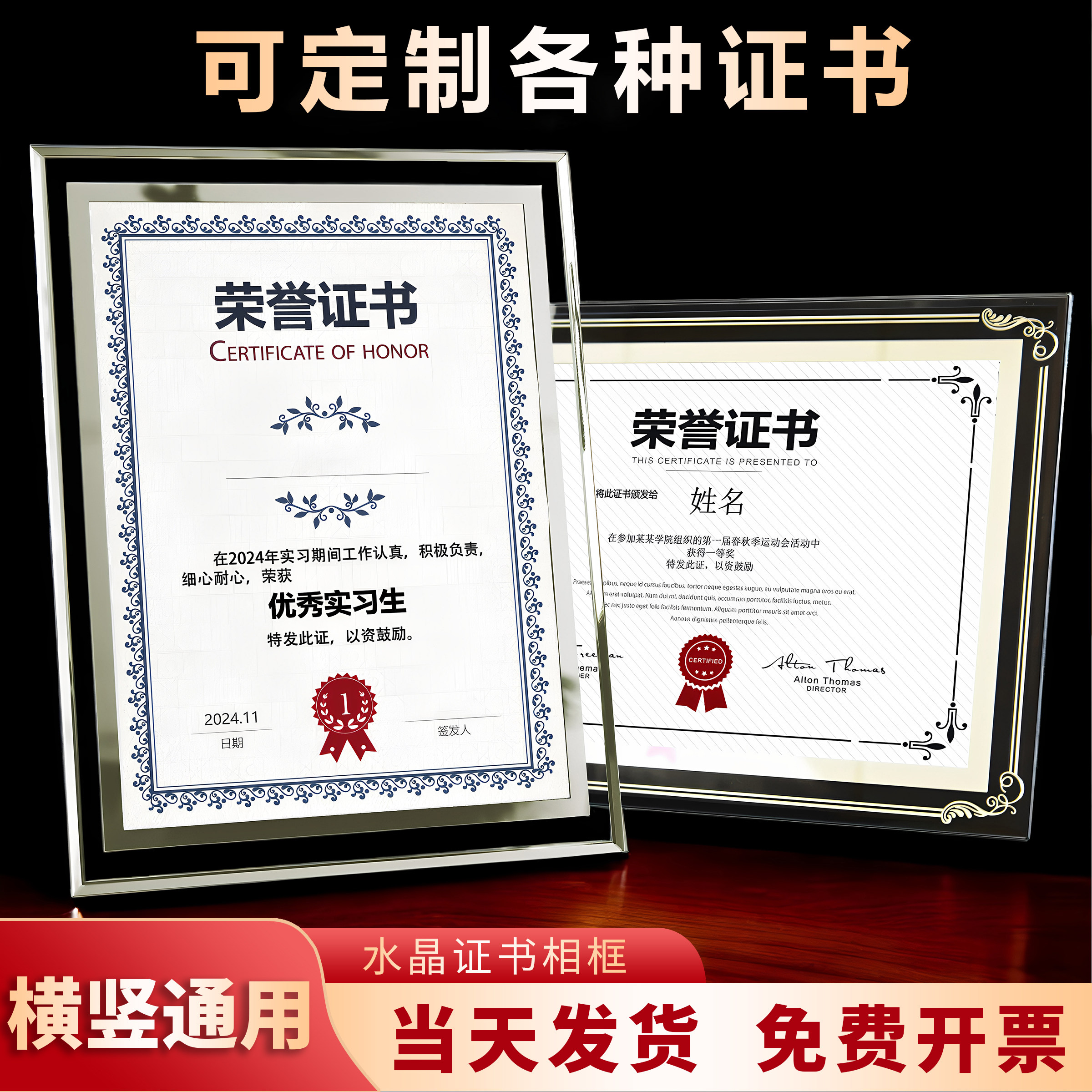 玻璃水晶相框摆台12寸荣誉授权书框架A4证书框奖状挂墙画框奖牌