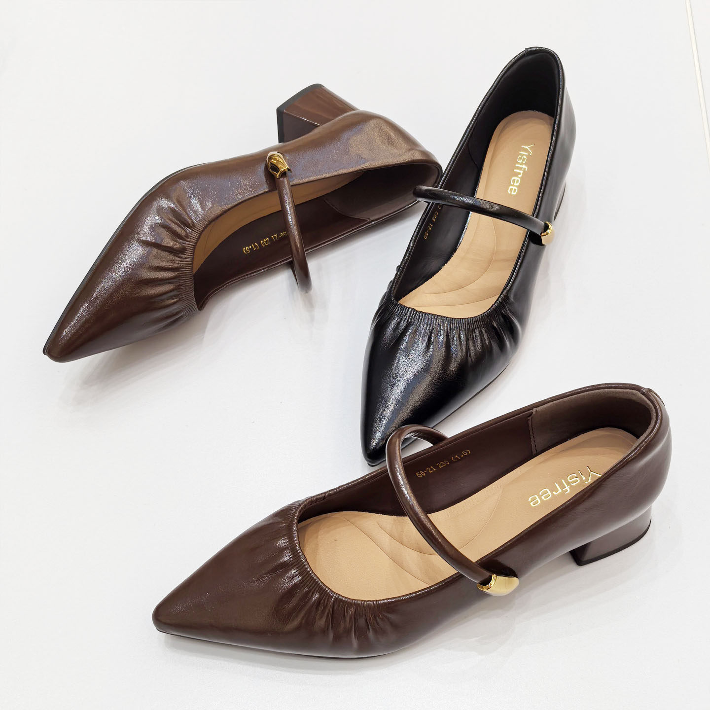 青蕴真皮复古皮带扣尖头单鞋女2025春夏新款英伦小皮鞋粗跟玛丽鞋