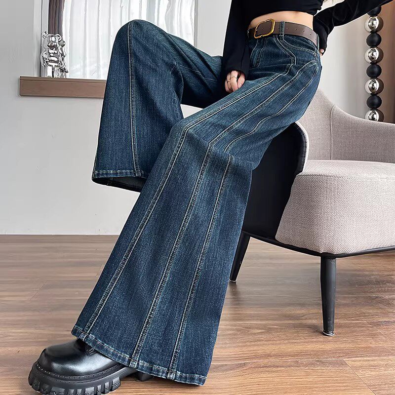 美式复古弹力阔腿牛仔裤女冬季爆款加绒加厚宽松遮肉大脚喇叭裤子