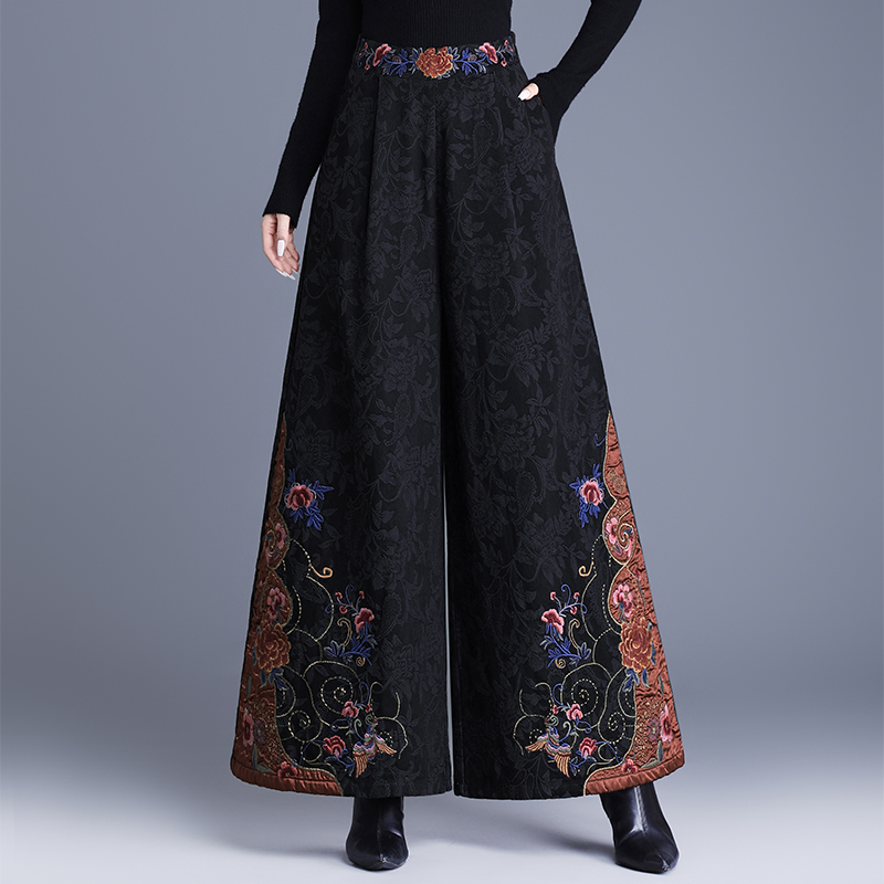 秋冬中国风重工绣花高腰阔腿裤女复古宽松提花棉休闲长裤子大脚裤