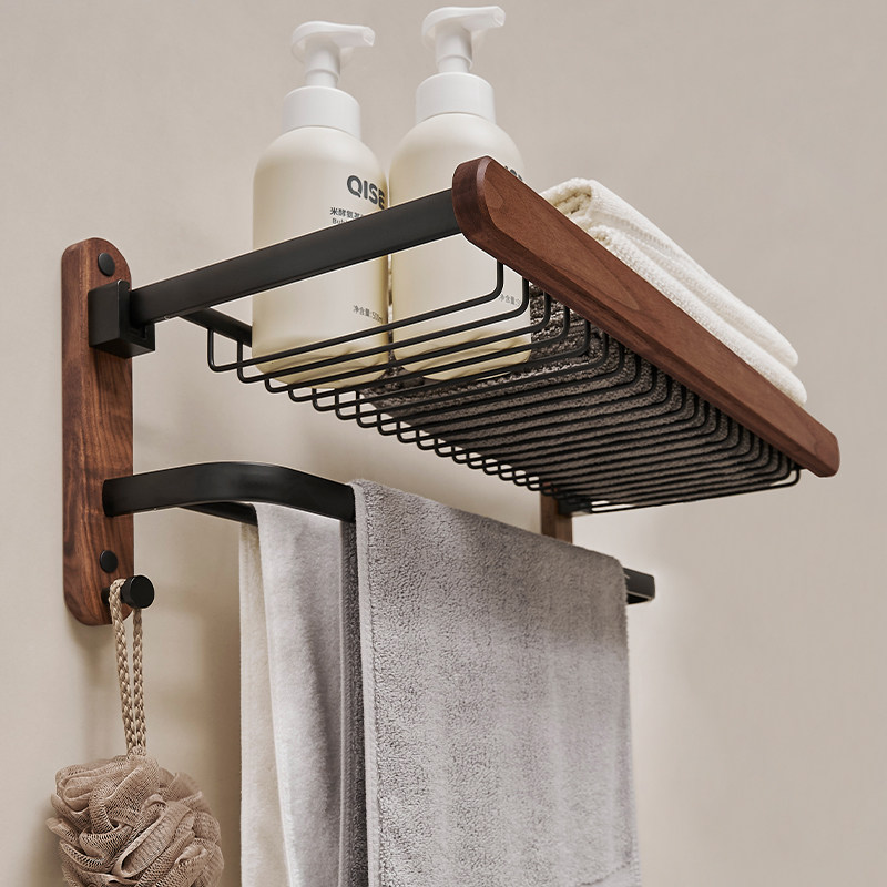 胡桃木高端卫生间毛巾架浴室架子置物架免打孔卫浴厕所浴巾架一体