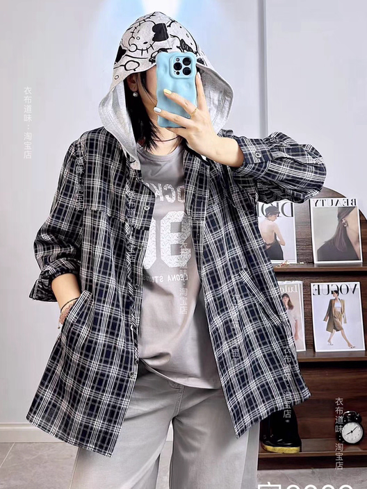 宜语析6009春加大码外套女 微胖专属帽格纹宽松显瘦叠穿衬衫