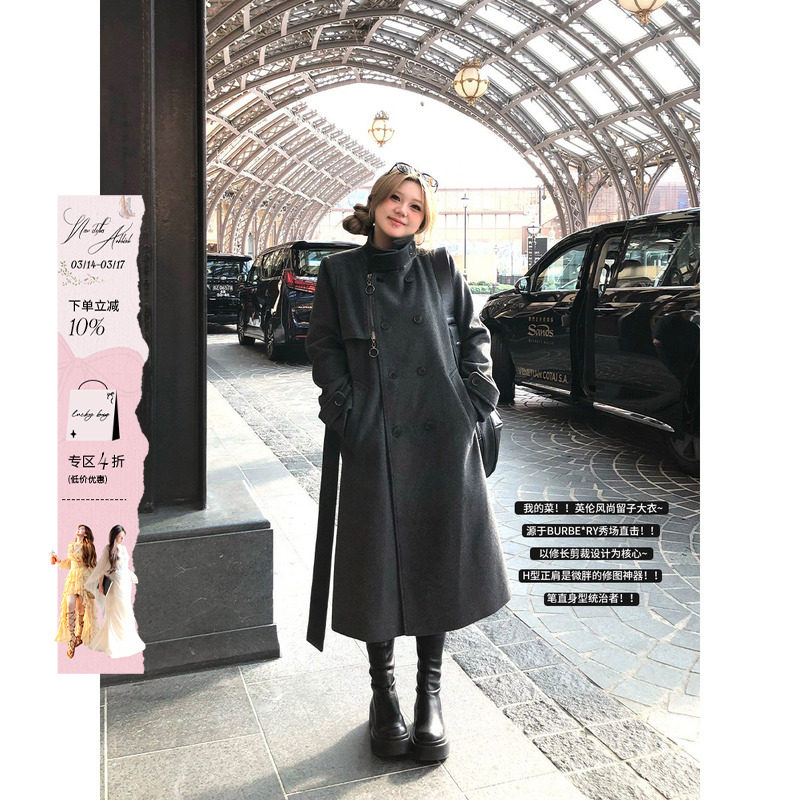 安妮不火 格雷系双排扣毛呢外套女2025秋冬新款微胖大码呢子大衣