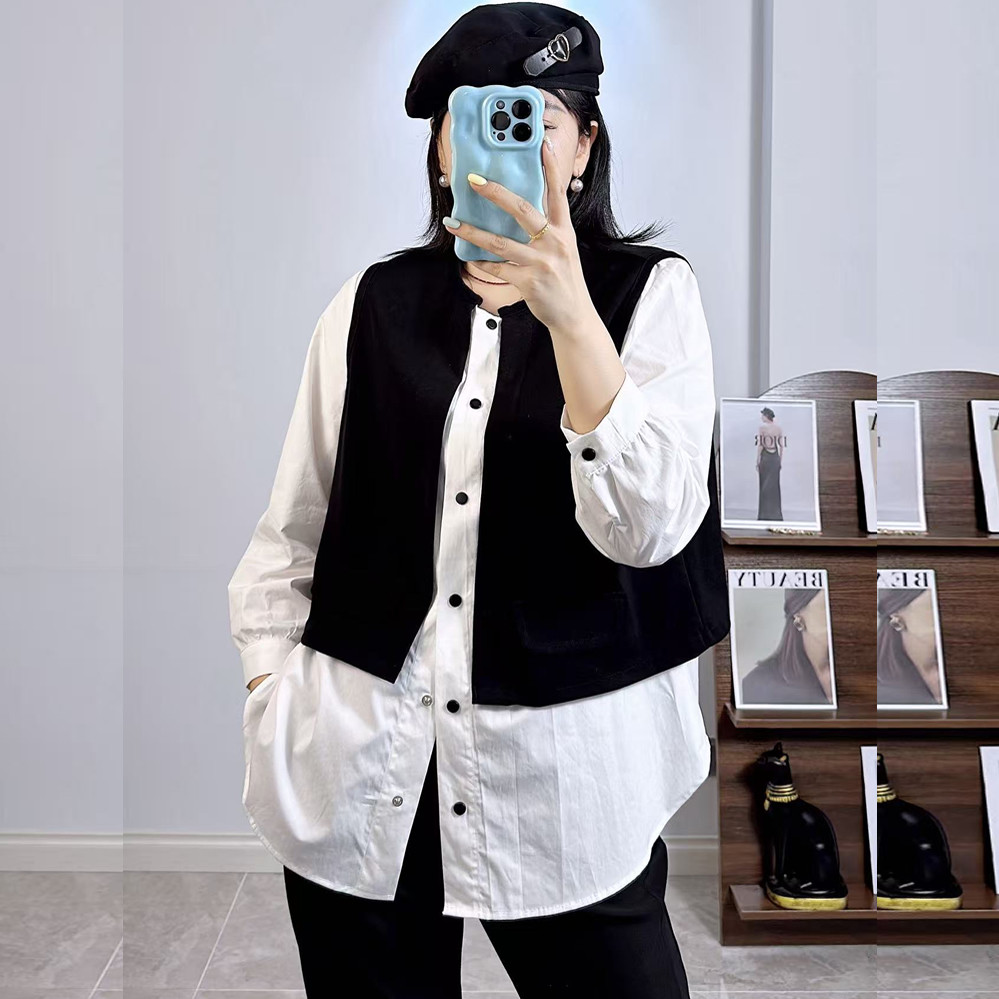 爆款超好看拼接衬衫外套女春秋款胖mm大码时尚洋气设计感撞色上衣