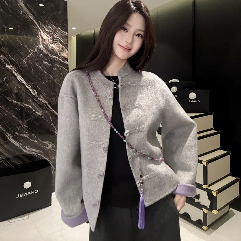 爵莱菲2025冬季国风盘扣短上衣烟灰紫新中式双面呢大码外套女