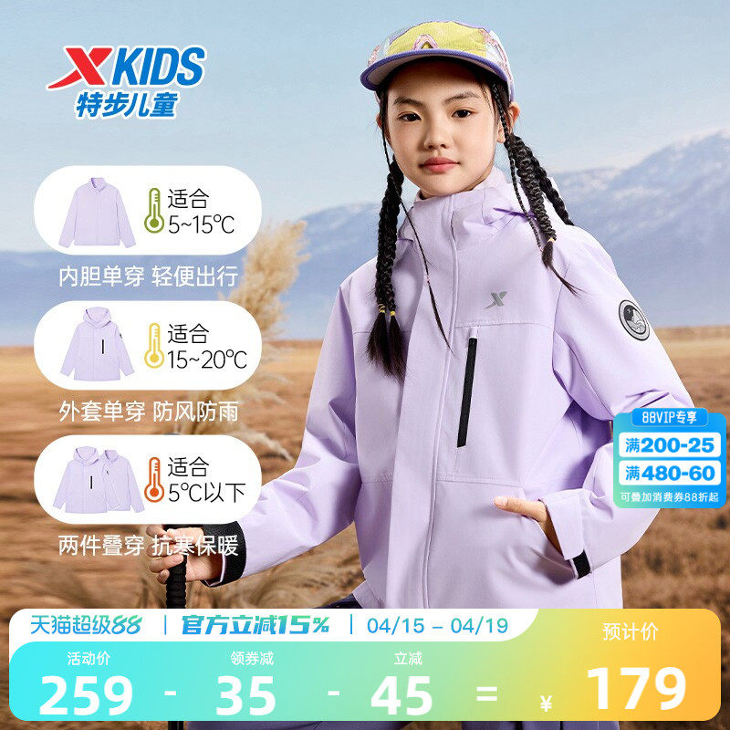 特步童装儿童三合一外套女童春季2026新款户外上衣摇粒绒防风衣