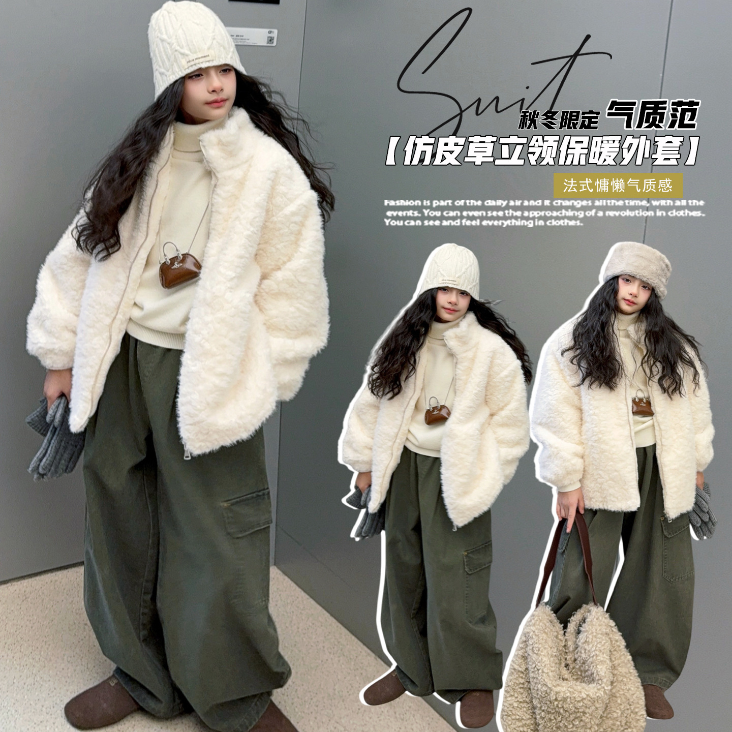 女童仿皮草毛毛外套工装弯刀裤2025秋冬中大童休闲时尚仿皮草大衣