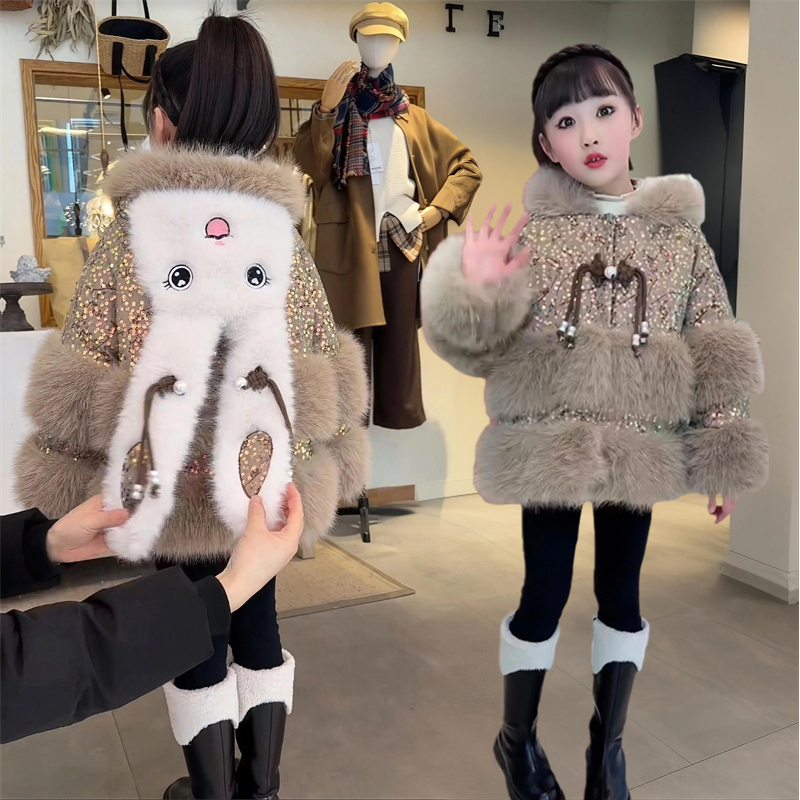 女童仿皮草外套2025新款儿童加绒加厚宝宝冬季毛毛衣连帽兔耳朵潮