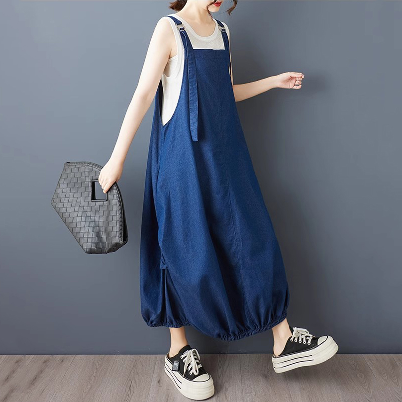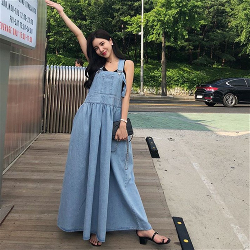 折扣春夏新品韩版宽松大码休闲复古中长款显瘦纯色牛仔背带连衣裙
