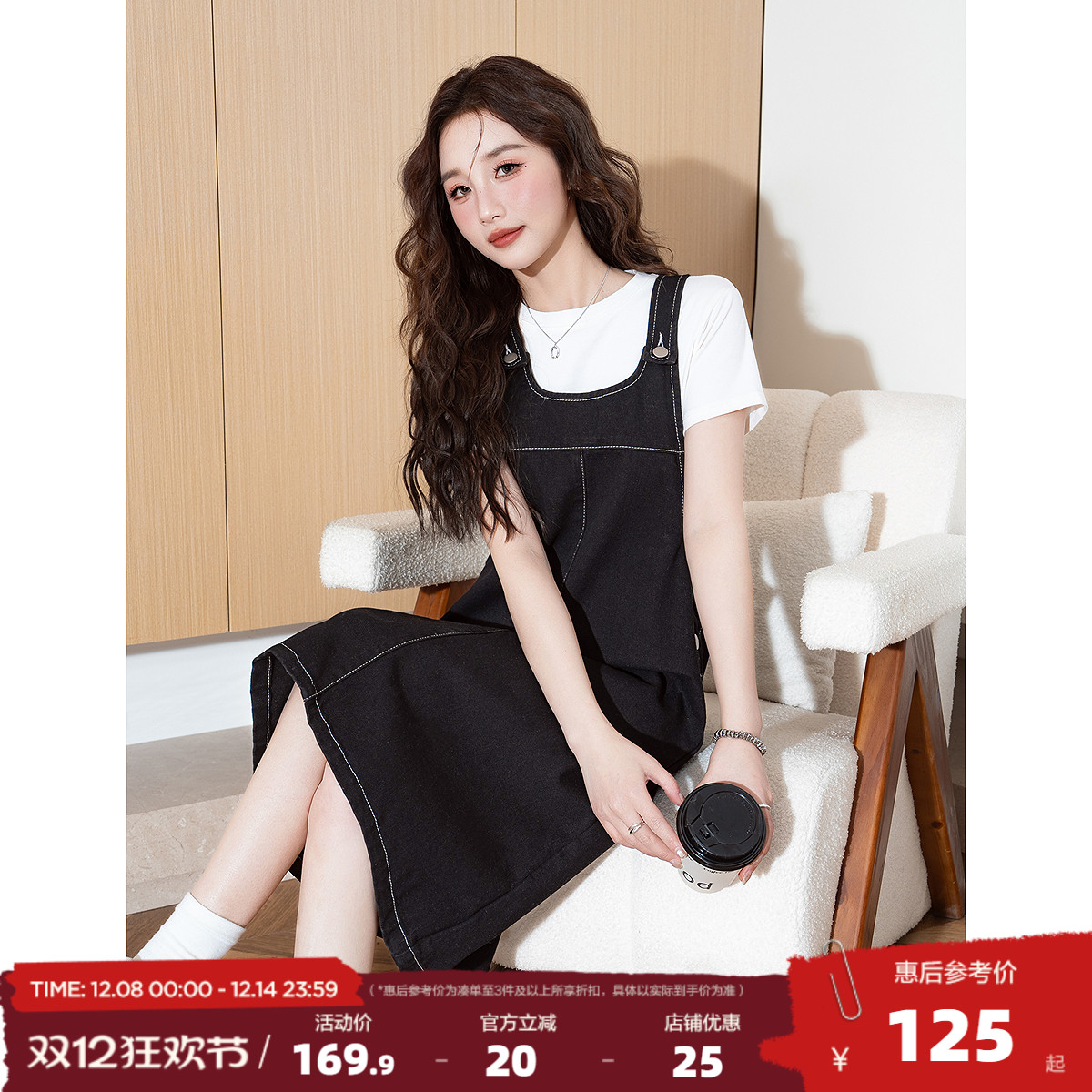 2025秋裙新款加大码百搭宽松开叉背带连衣裙中长款牛仔吊带裙潮裙