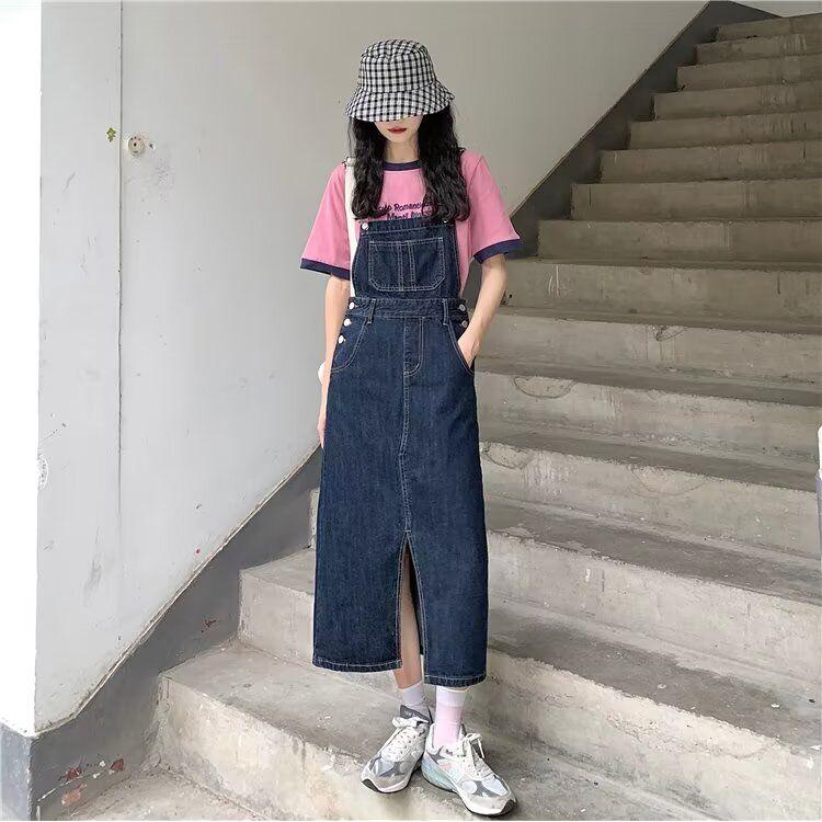 韩国ins网红开叉中长款牛仔背带裙 韩版学生显瘦高腰休闲连衣裙女