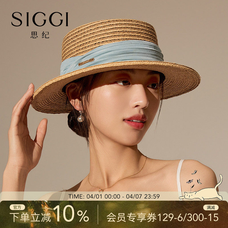 siggi 拉菲草帽女夏法式复古平顶防晒帽时尚休闲海边度假平檐礼帽