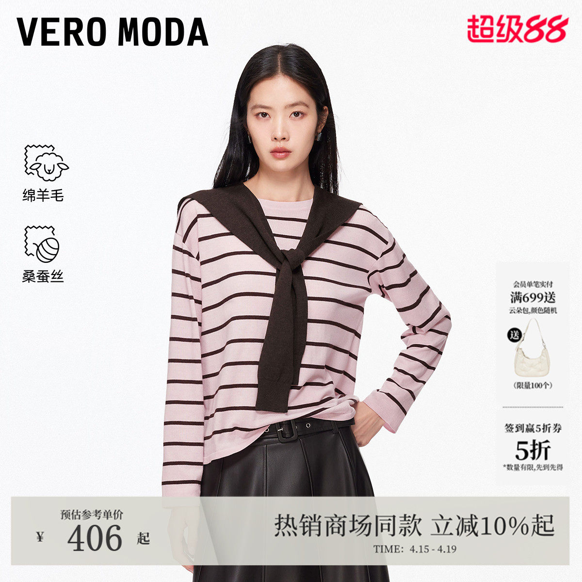 Vero Moda针织衫女26春新款含绵羊毛桑蚕丝系带条纹毛衣326124023