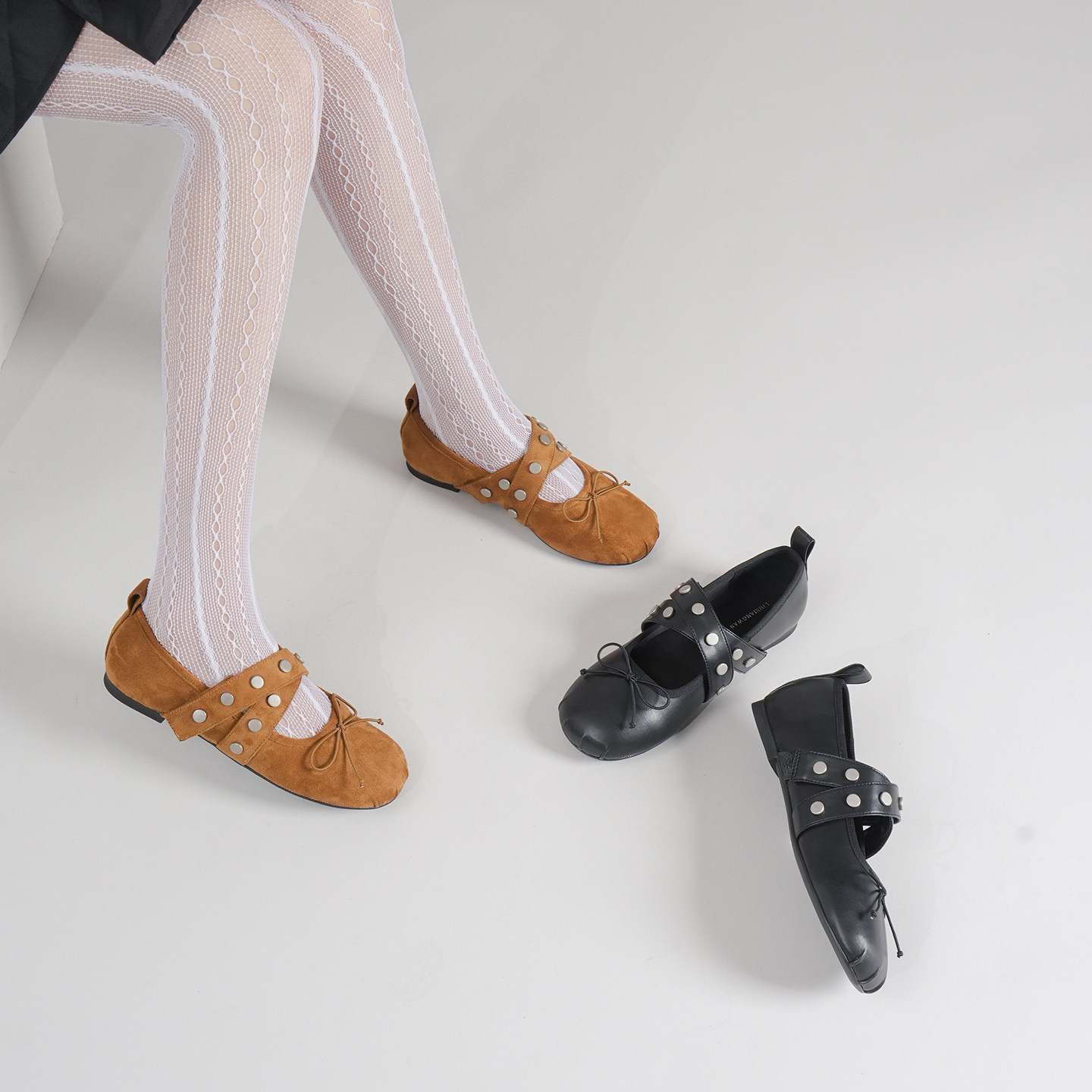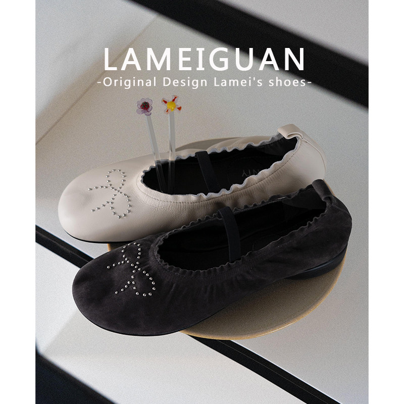 林向晚 叛逆千金~褶皱圆头蝴蝶结玛丽珍鞋女金属铆钉风芭蕾平底鞋