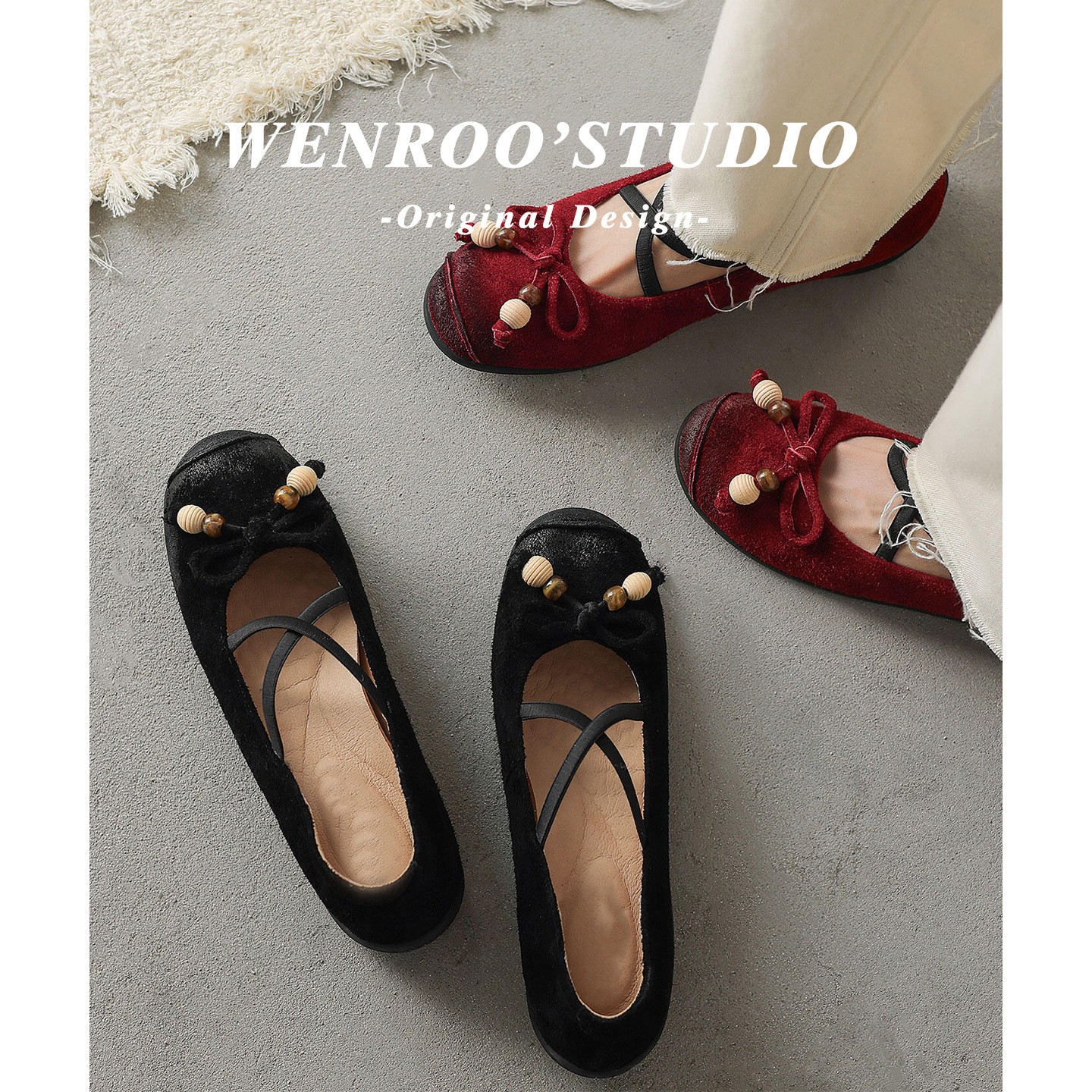复古圆头蝴蝶结温柔小红鞋女软平底法式配裙子绒面不磨脚奶奶单鞋