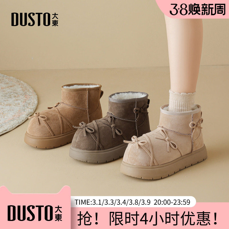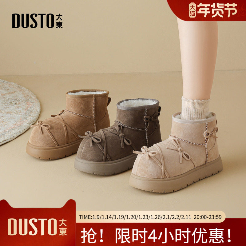 大东雪地靴女鞋2025年冬季新款舒适平底中跟圆头套脚蝴蝶结D0205