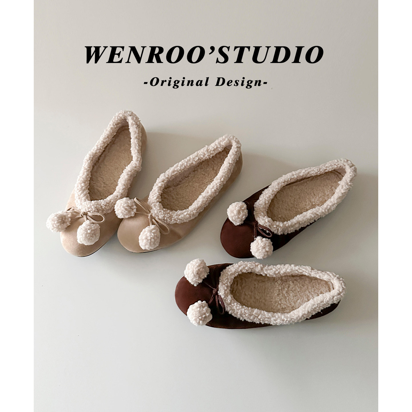 法式蝴蝶结加绒圆头芭蕾单鞋女2025秋冬新款复古平底羊羔毛毛棉鞋