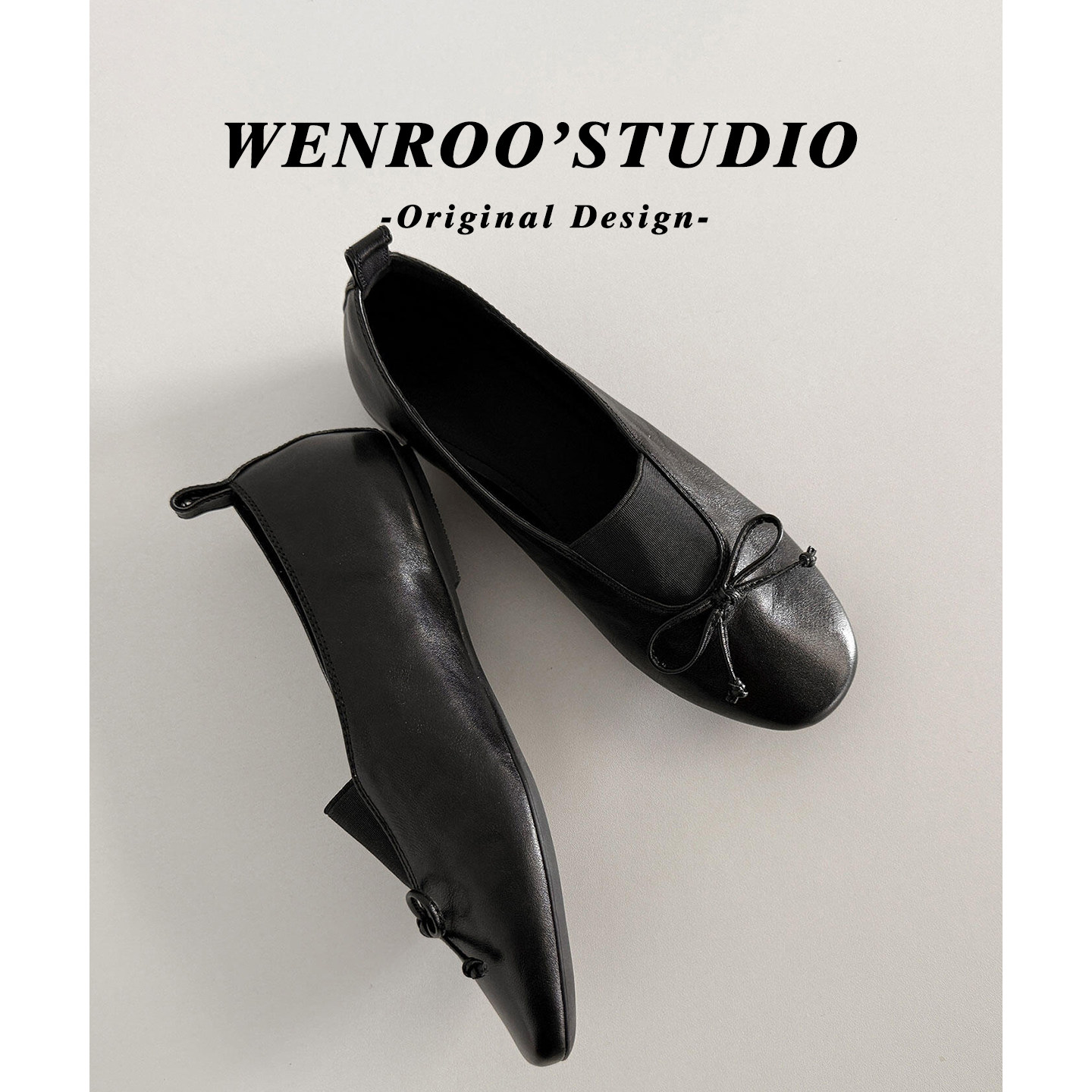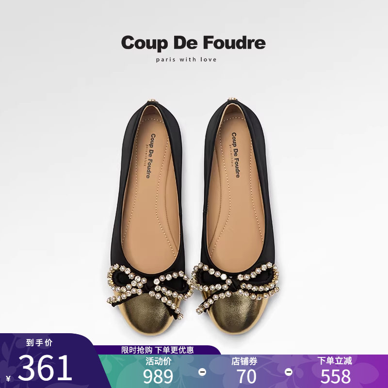 CDF女鞋轻奢秋季新款百搭真皮拼接法式蝴蝶结圆头平底鞋浅口单鞋