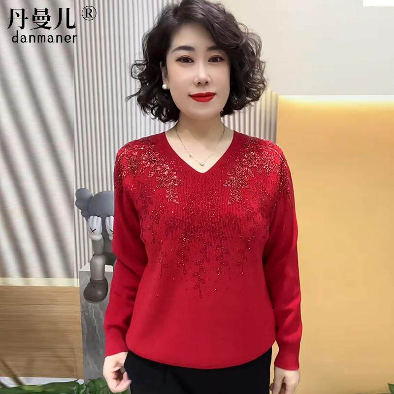 艾靓依秋装新款V领妈妈针织衫九分袖宽松打底衫中老年女装毛衣薄