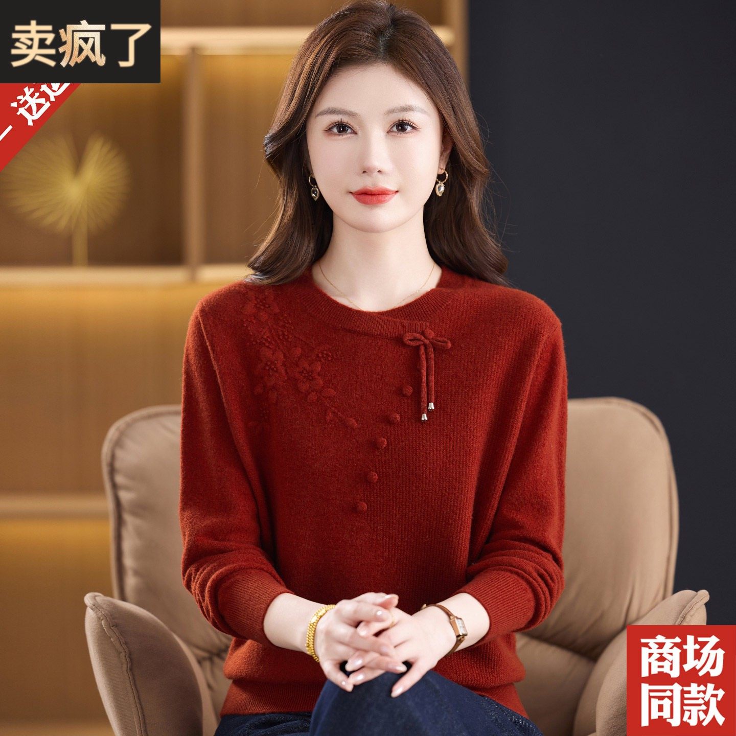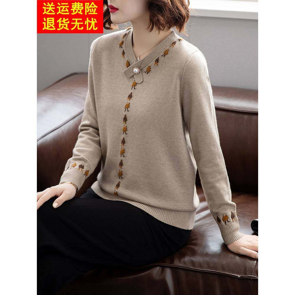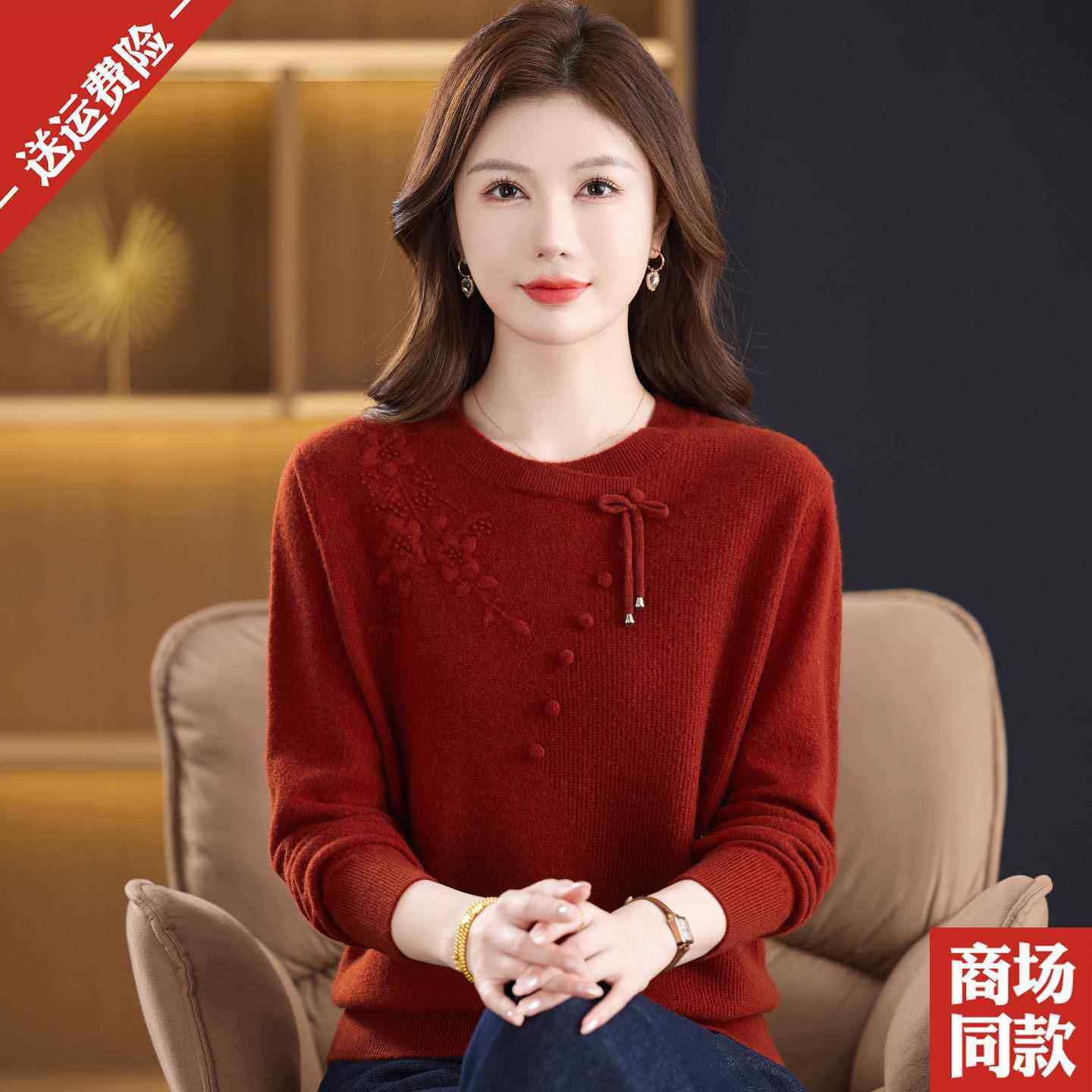 加厚藏羊绒衫女妈妈装圆领刺绣羊毛衫中老年女装毛衣冬季打底上衣