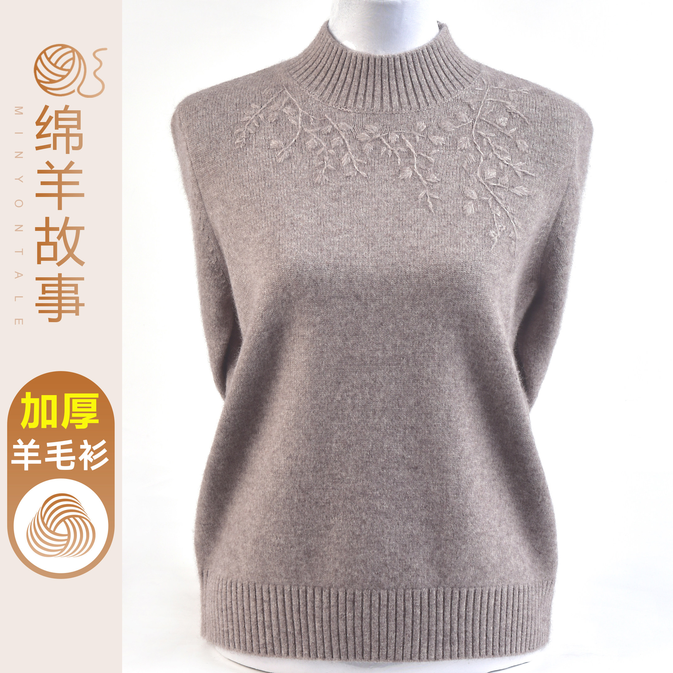 洋气妈妈加厚羊毛衫女半高领藏羊绒刺绣针织打底衫中老年女装毛衣