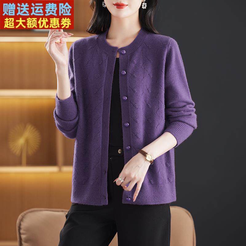 妈妈纯羊绒衫高档圆领针织外套秋冬季保暖中老年女装毛衣新款开衫