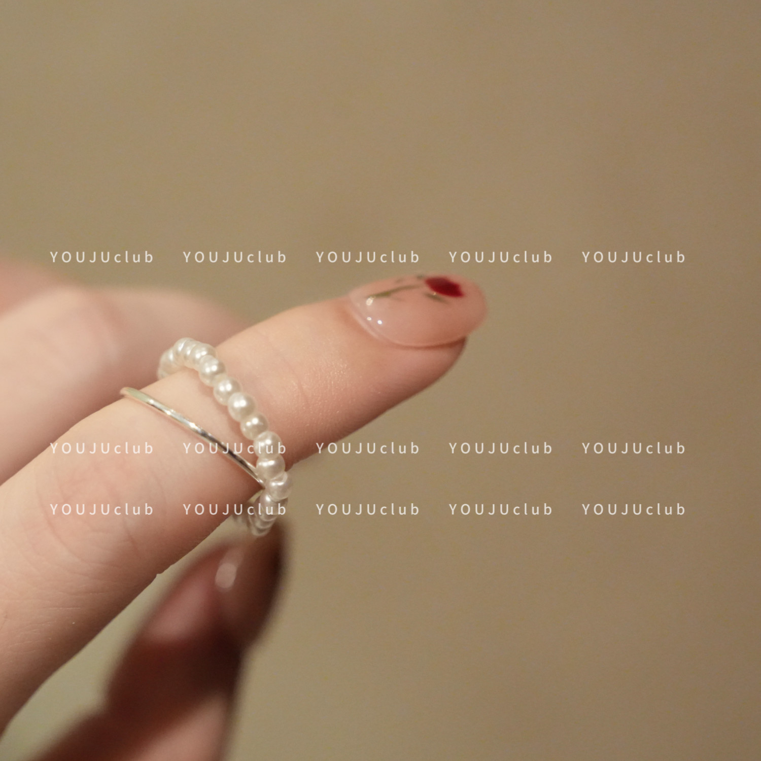 YOUJUclub-叠戴交叉~气质温柔珍珠银色磨砂戒指简约高级感食指戒