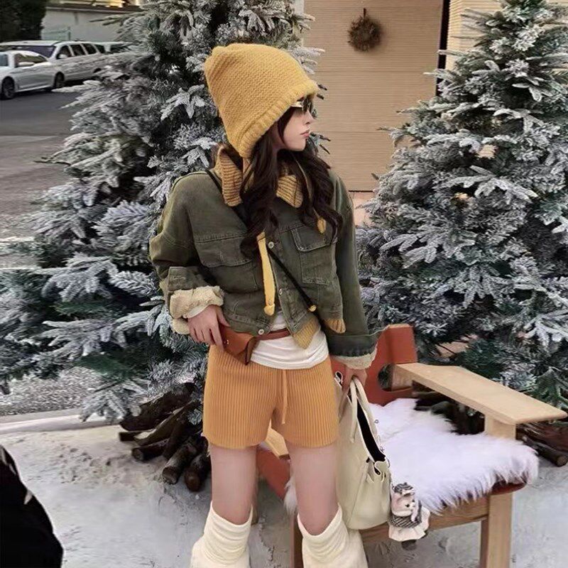 高级感黄绿色加绒牛仔外套女短款秋冬新款设计感针织拼接夹克棉衣