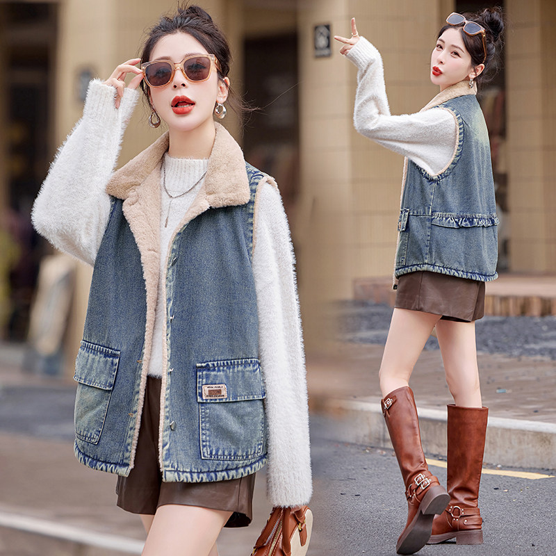 加绒加厚牛仔马甲女秋冬2025新款百搭短款小个子羊羔绒背心外套潮