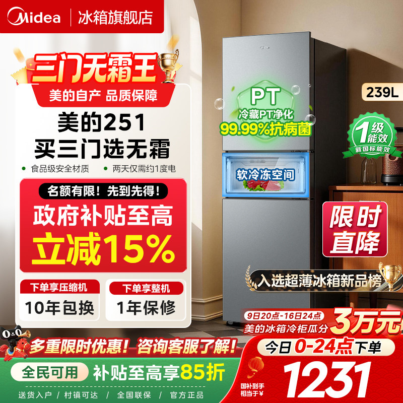 美的251三门无霜王冰箱家用超薄小户型租房一级能效节能风冷无霜