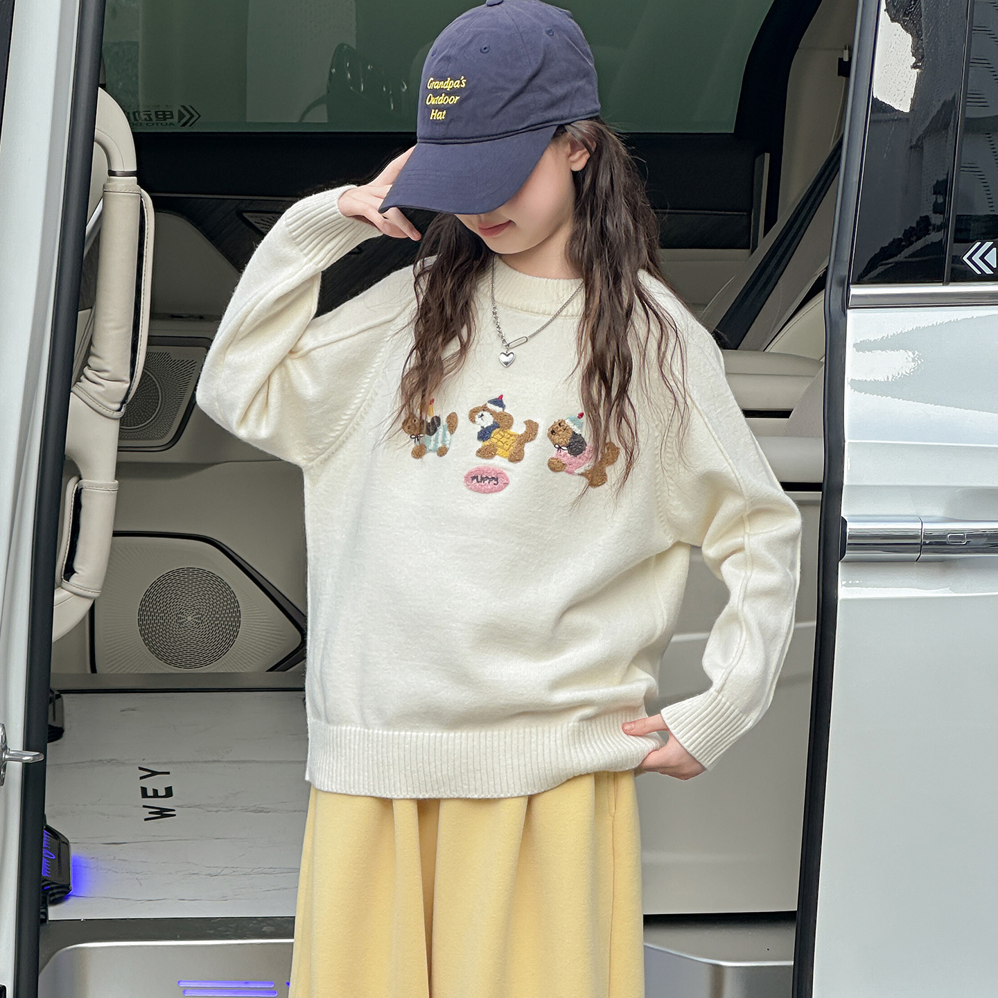 2025韩版女童慵懒风简约绣花图案针织上衣中大童透气宽松套头毛衣