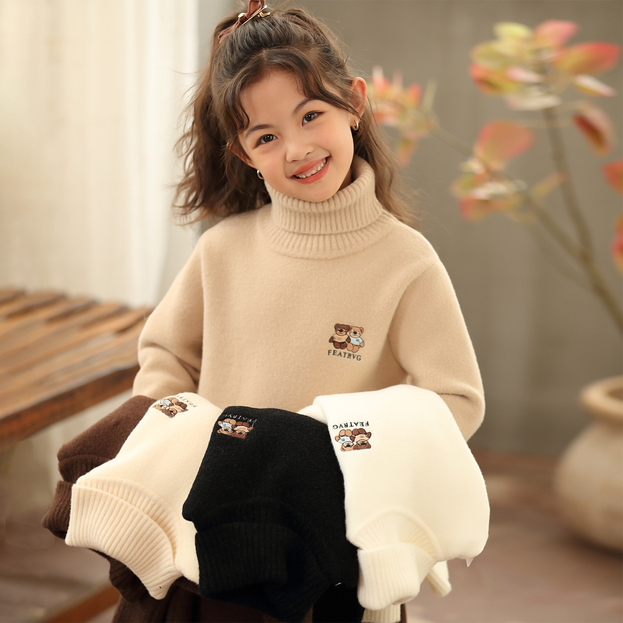 女童2025秋冬新款金丝刺绣小熊毛衣套头百搭加绒加厚韩版毛衣潮
