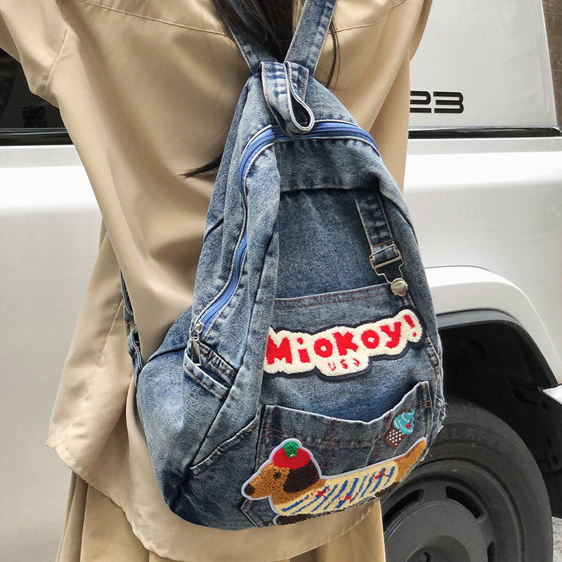 复古水洗牛仔布双肩包可爱腊肠狗大学生背包小众大容量休闲旅行包