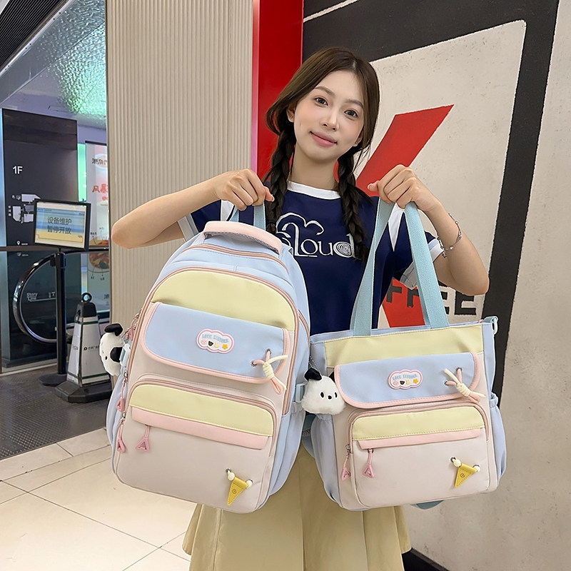 高颜值卡通笔筒双肩包女大容量撞色可爱初中生小学生书包上课背包