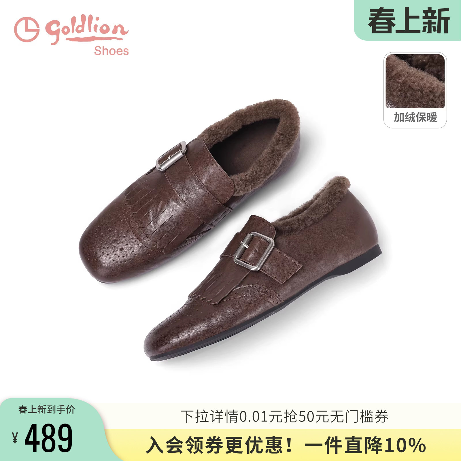 金利来一脚蹬乐福鞋女2025冬季新款女鞋布洛克流苏加绒保暖小皮鞋