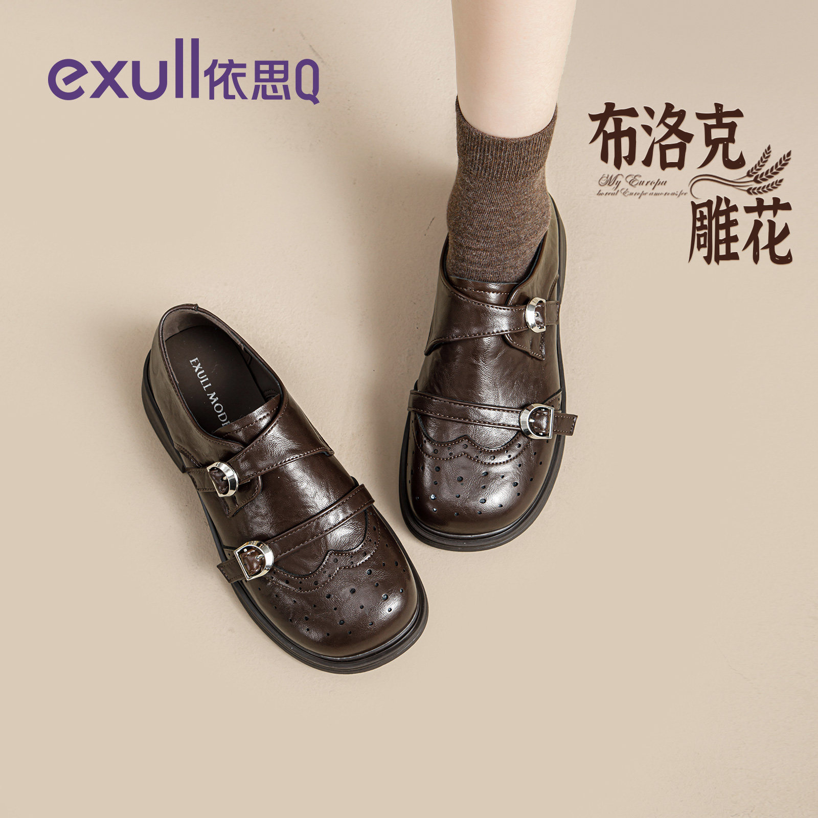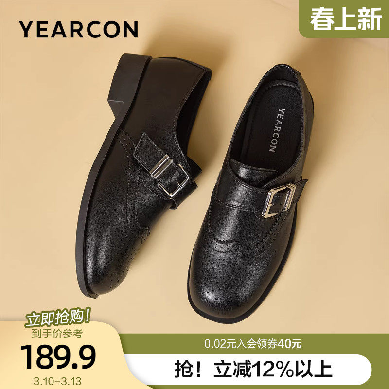 意尔康布洛克雕花小皮鞋女2026春季新款老钱风一脚蹬粗跟乐福鞋女