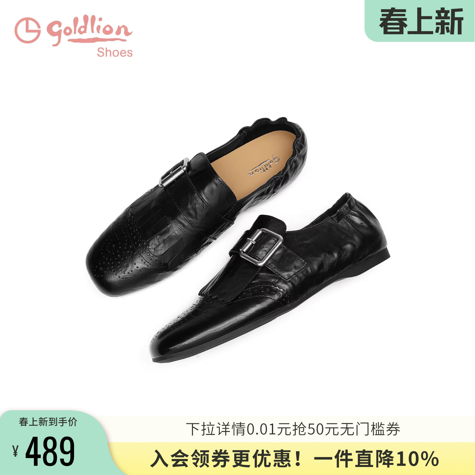 金利来真皮休闲乐福鞋女2026春季新款复古布洛克一脚蹬黑色小皮鞋