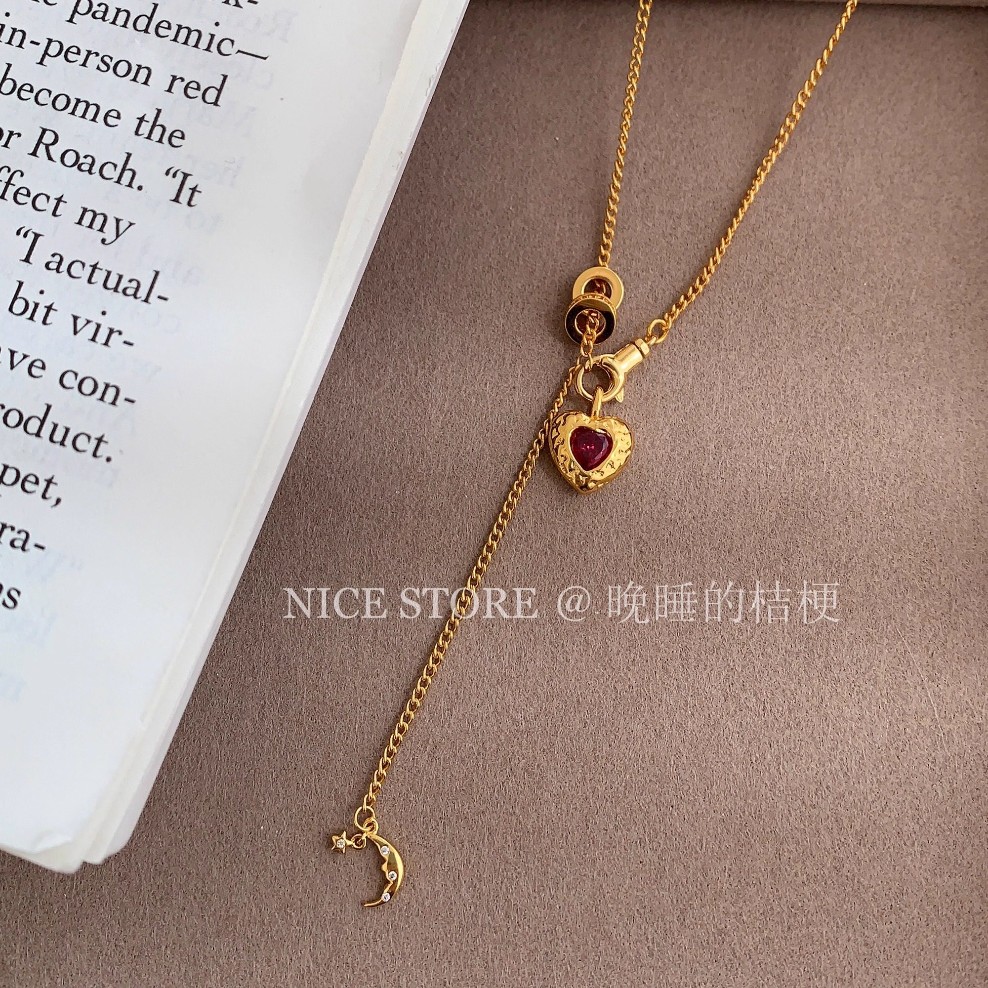晚睡的桔梗「露比」 vintager复古爱心月亮项链独特轻奢锁骨链