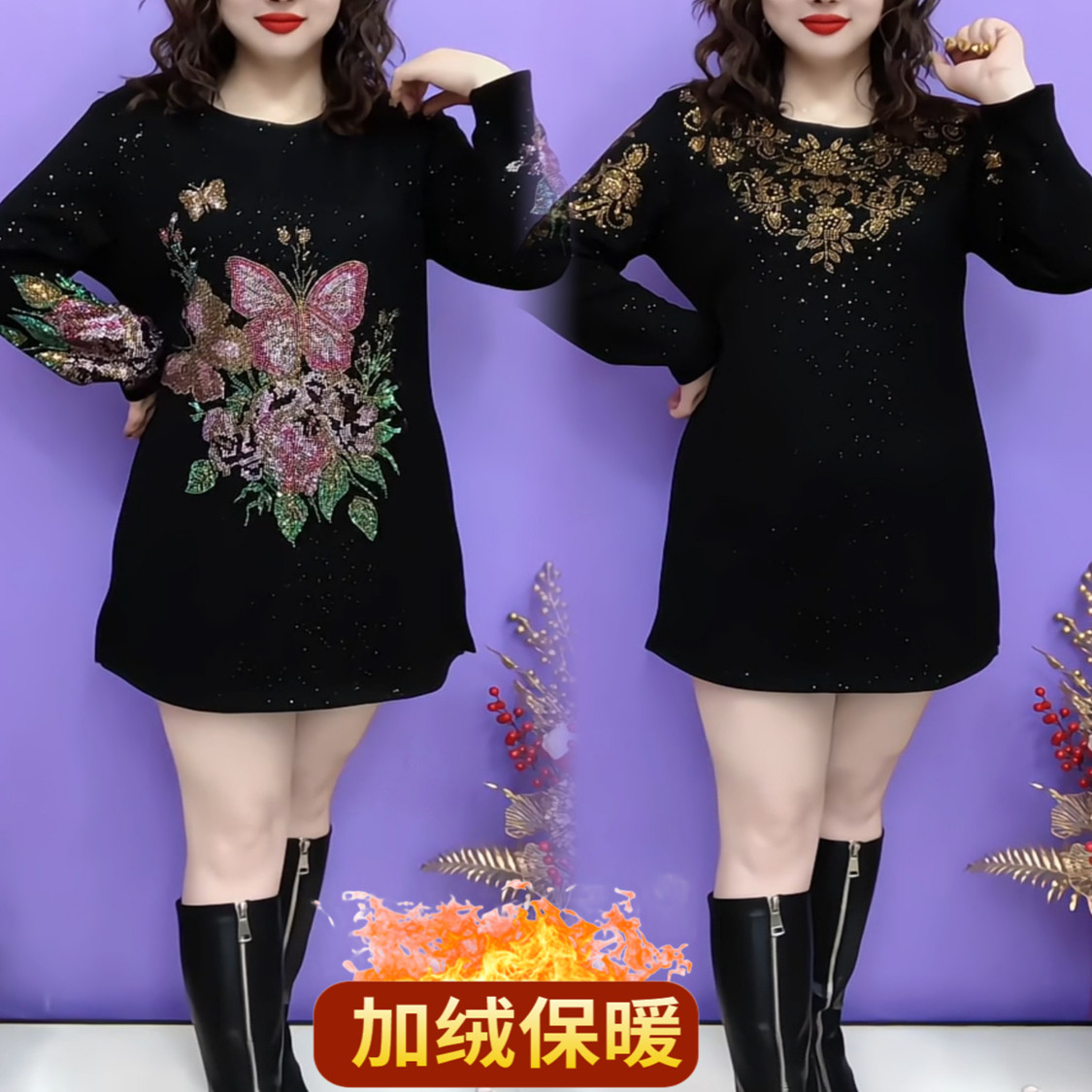 蝴蝶烫钻连衣裙女2025冬季加绒时尚减龄重工中长款妈妈保暖打底裙