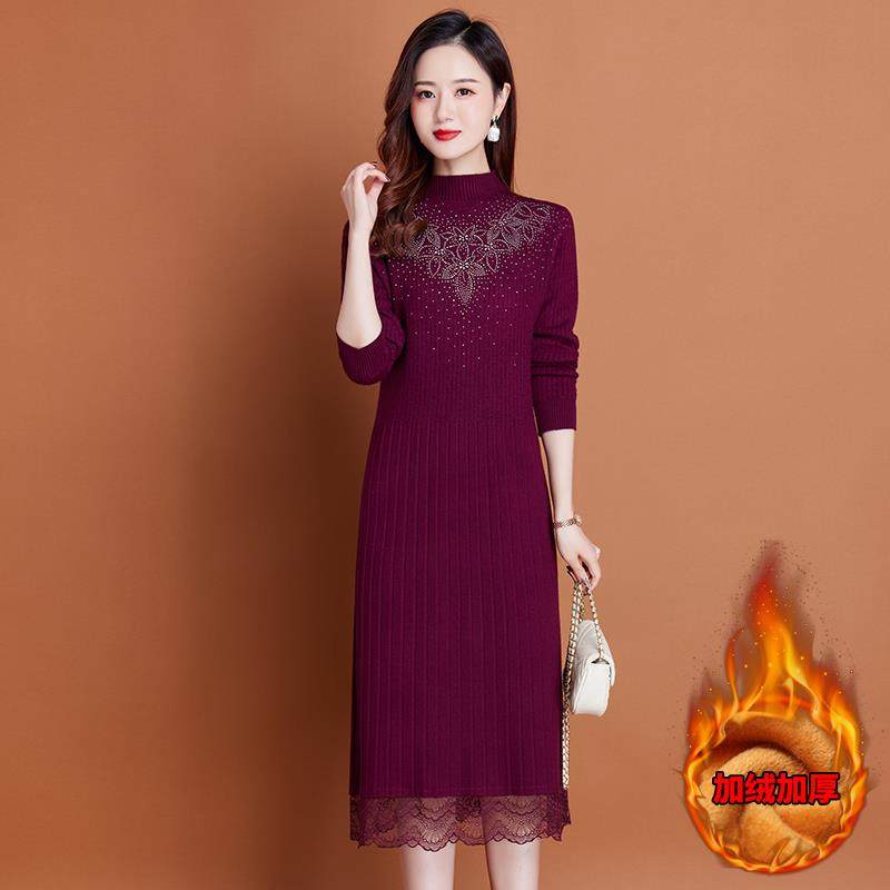冬季长袖连衣裙2023年新款妈妈装加绒加厚绣花中长款打底衫蕾丝衫