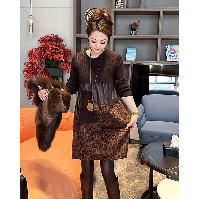 针织拼接加绒连衣裙女士冬季中长款2025新款高级感遮肉豹纹直筒裙