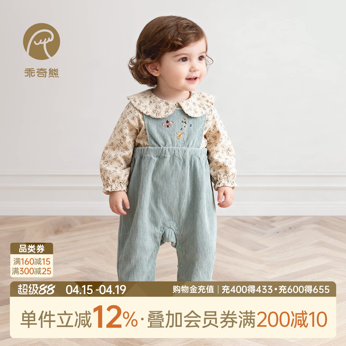 乖奇熊女宝宝抓绒背带裤春秋季婴儿纯棉保暖连体裤子春装外穿长裤